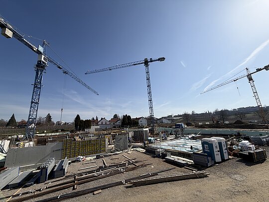 Der Bau schreitet planmäßig voran. Mit jedem Baufortschritt wird deutlicher, wie das neue Quartier einmal aussehen wird: moderne Architektur, durchdachte Grundrisse und viel Raum zum Wohlfühlen.